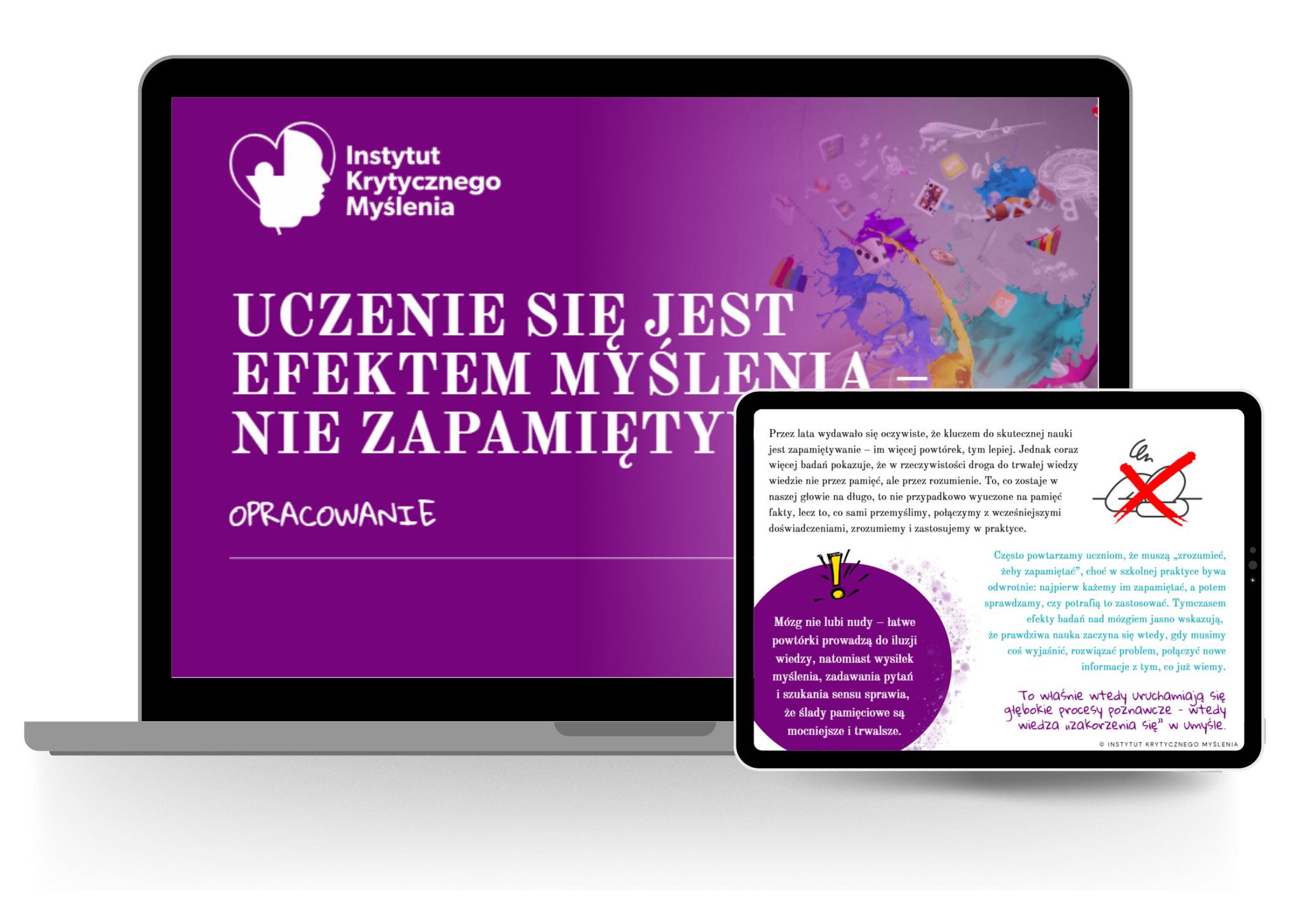 Odwiedź uczenieprzezmyslenie.pl — to merytoryczne wprowadzenie do zmiany paradygmatu w edukacji, oparte na badaniach i praktyce szkolnej. Znajdziesz tam wyjaśnienie, dlaczego tradycyjne uczenie nie działa i jak w jego miejsce wprowadzać kulturę myślenia, która angażuje uczniów, rozwija krytyczne myślenie i buduje trwałe rozumienie.